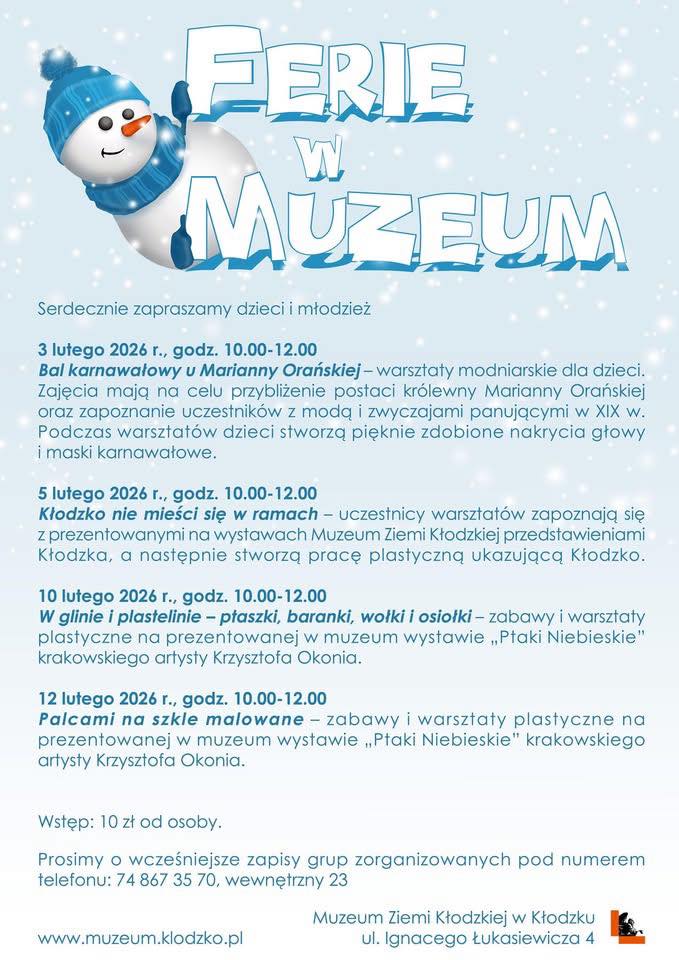 Na mieszkańców i gości miasta czekają kolejne propozycje przygotowane przez Muzeum Ziemi Kłodzkiej, Kryte Lodowisko Kłodzko oraz Kłodzki Ośrodek Kultury. Zachęcam do korzystania z oferty i aktywnego spędzania czasu wolnego w naszym mieście.