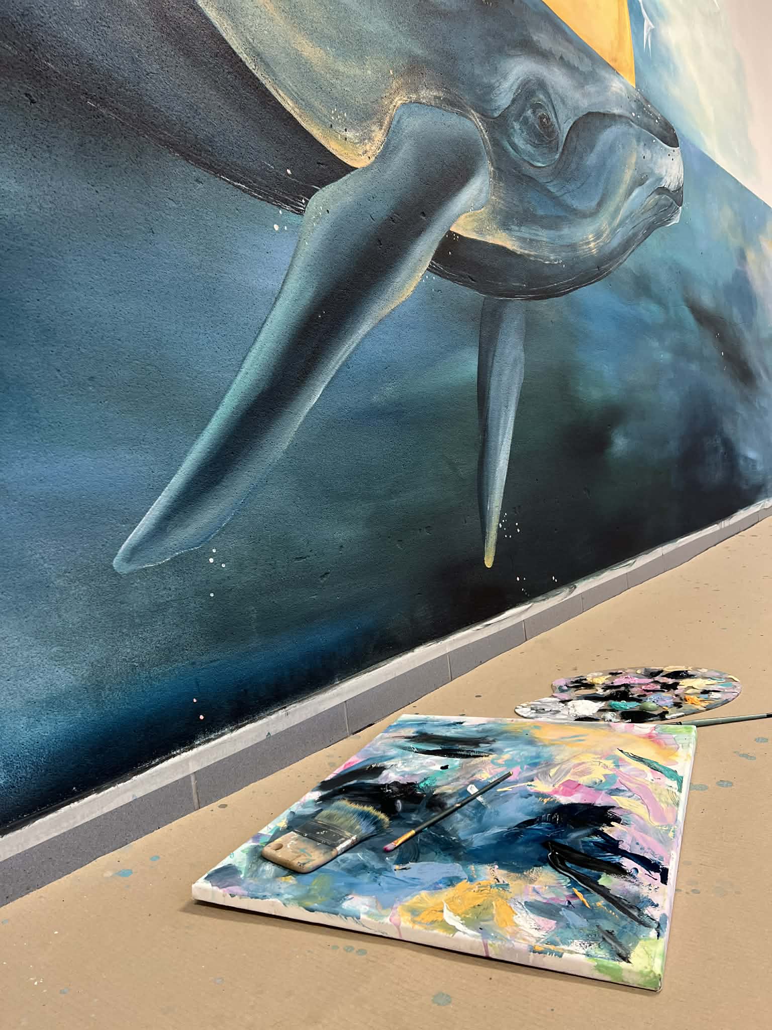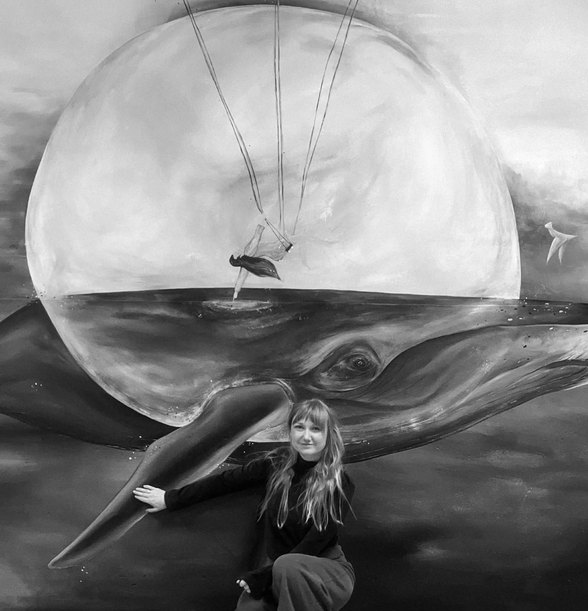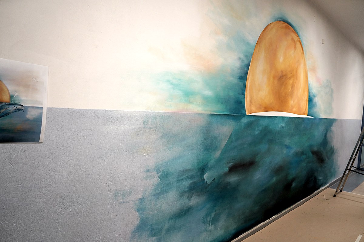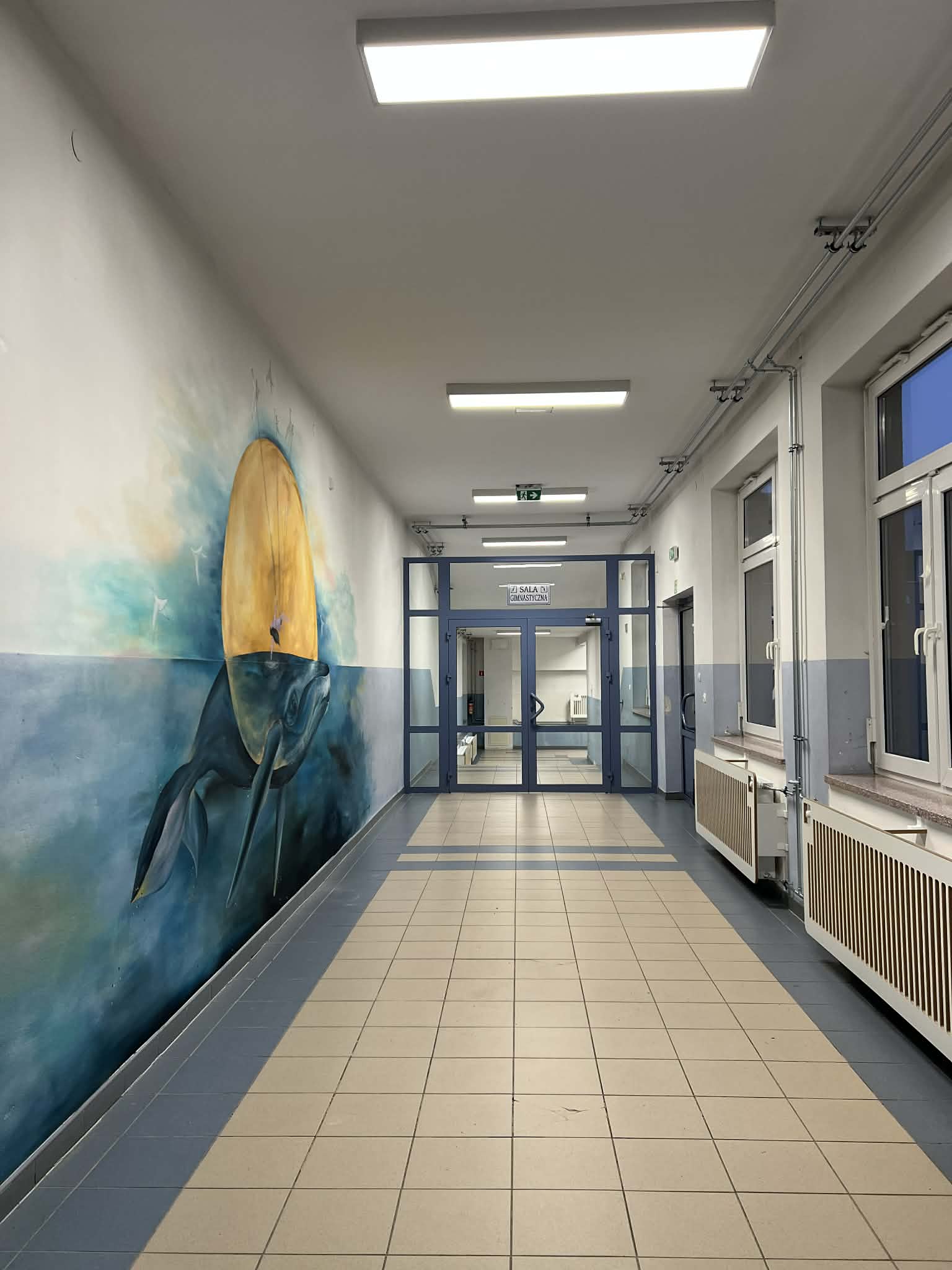 Każda z moich prac zaczyna się od tej samej potrzeby: stworzenia wizualnej, twórczej i emocjonalnej opowieści. Pracuję z przestrzenią, estetyką i doświadczeniem – zwłaszcza w instytucjach i obiektach użyteczności publicznej. Łączę myślenie projektowe z wrażliwością społeczną i praktyką realizacyjną. Malarstwo ścienne szybko stało się dla mnie czymś więcej niż techniką – to przestrzeń, w której można opowiedzieć o emocjach, wartościach i marzeniach. Traktuję je jako narzędzie dialogu i budowania relacji między miejscem a człowiekiem. To wielka duma być częścią tak wielu przedsięwzięć, które codziennie niosą radość i służą wielu samorządom w Polsce, np. w Trzebnicy czy w Bochni – mówi Karolina Siejda. Ten mural opowiada historię o drodze, marzeniach i odwadze bycia sobą. To zaproszenie do podróży – tej codziennej i tej najważniejszej: w głąb siebie. Wieloryb symbolizuje siłę, spokój i mądrość. To bezpieczna przestrzeń – coś, co niesie i wspiera, nawet gdy wokół jest wielka, nieznana przestrzeń. Dla dzieci może być przyjaznym opiekunem-przewodnikiem, który zabiera w podróż przez wyobraźnię. Dla młodzieży – przypomnieniem, że ich głos, marzenia i wrażliwość mają znaczenie. Dla dorosłych – znakiem doświadczenia i wewnętrznej siły, którą budujemy i nosimy w sobie przez całe życie. Złote słońce na grzbiecie wieloryba to marzenia, potencjał i światło, które każdy z nas ma w sobie. Jest jak cel, do którego dążymy, ale też jak energia, która nas napędza. Czasem świeci mocniej, czasem jest przysłonięte chmurami – ale zawsze jest obecne. Postać unosząca się nad wielorybem to symbol wolności, odwagi i twórczości (w tym kreacji życia). To dziecko, nastolatek i dorosły jednocześnie – każdy, kto odważa się marzyć i iść swoją drogą. Taśmy, na których się unosi, przypominają, że choć każdy z nas pochodzi z innego miejsca, posiada inne doświadczenie – mamy potencjał, by wznieść się wyżej. To też symbol tego, że jeśli zaufamy i damy się ponieść to zawsze znajdziemy kierunek i sposób, aby realizować swoje marzenia. Dotyk wody mówi o odwadze, ciekawości świata i życia. To połączenie z naturą. Mówi: „Nie bój się. Czeka na Ciebie coś pięknego i dobrego.” To moment magii, cudów. Moment obecności, bycia tu i teraz. Ptaki w tle są znakiem myśli, wyborów i możliwości. Każdy z nich jest w podróży i przebywa swoją indywidualną drogę, tak jak każdy uczeń, nauczyciel i absolwent tej szkoły. To przesłanie, że my też jesteśmy jak te ptaki – jak te ptaki dajemy innym wsparcie i dajemy innym latać. Bo jesteśmy jednością. Razem możemy więcej. Ten mural powstał w Szkole Podstawowej w Pszennie – miejscu, które było początkiem wielu historii, również mojej. Jako absolwentka tej szkoły wracam tu i zostawiam ślad, który ma przypominać, że niezależnie od wieku, zawsze warto wierzyć, że nasze marzenia pewnego dnia się spełnią. Do dzieła!