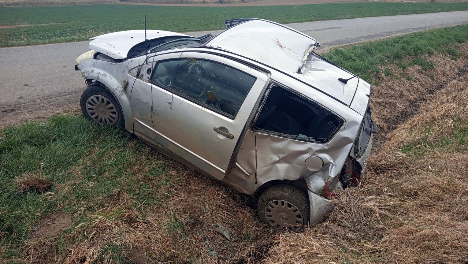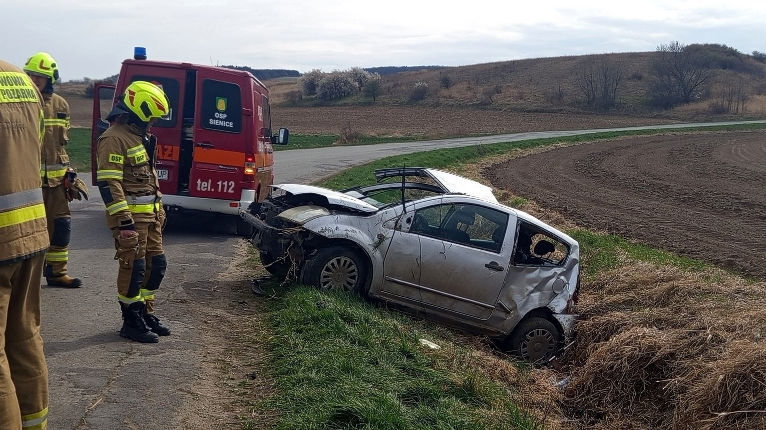 4 kwietnia około godziny 14:20, dyżurny stanowiska kierowania PSP w Dzierżoniowie otrzymał zgłoszenie o wypadnięciu auta z drogi i uwięzionej kierującej w pojeździe, przy wyjeździe z Sienic. Pierwsi na miejsce przybyli druhowie z OSP Sienic, którzy przy pomocy narzędzi hydraulicznych wydobyli z pojazdu, przytomną około 40-letnią kobietę. Następnie przekazali przybyłemu zespołowi pogotowia, które odwiozło poszkodowaną do szpitala. Na miejscu pracował jeszcze zastęp PSP Dzierżoniów oraz patrol dzierżoniowskiej drogówki.