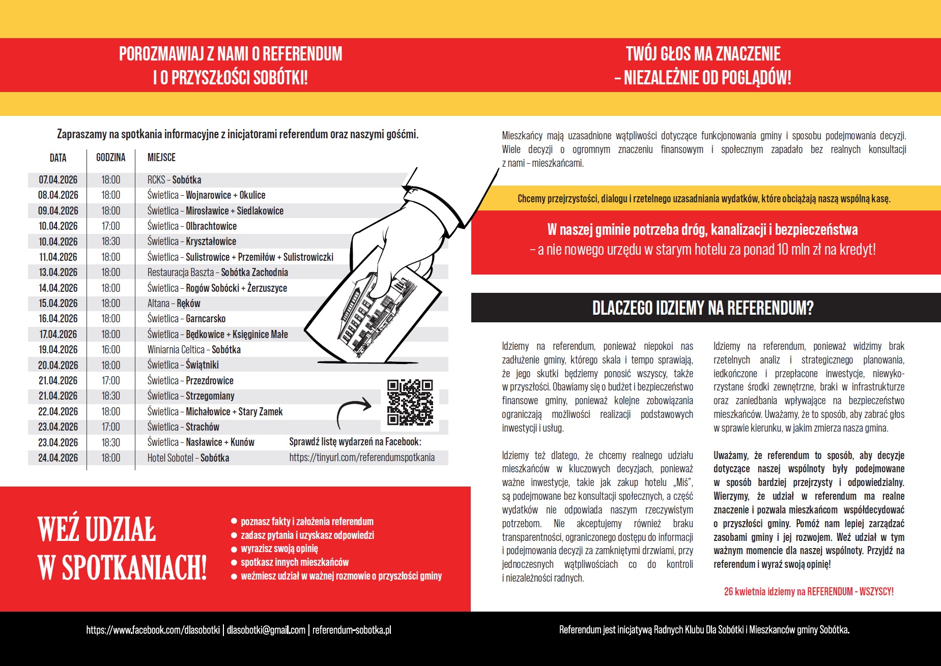 Pełna lista lokalizacji (łącznie 19 spotkań) dostępna jest w załączonej ulotce oraz w mediach społecznościowych Klubu Dla Sobótki.
