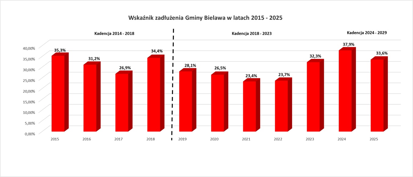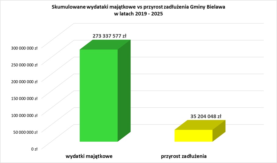 Średni ważony koszt obsługi tego zadłużenia wyniesie 0,72 % i wygeneruje odsetki w łącznej kwocie 2.216.588 zł. Zarówno kapitał, jak i odsetki będą spłacane przez 20 lat. Ponadto 5 % pożyczki, dotyczącej rewitalizacji przestrzeni miejskiej, zostanie umorzone, co pozwoli na redukcję zadłużenia Bielawy o 220.726 zł.