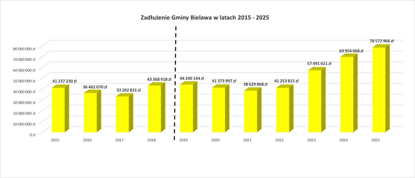 Biorąc pod uwagę fakt, iż średnie ważone oprocentowanie bielawskich papierów dłużnych wynosi 4,64 %, to łączny koszt odsetek z ich tytułu, w skali roku wynosi 719.155 zł, a w ciągu 20 lat wyniósłby 14.383.100 zł.