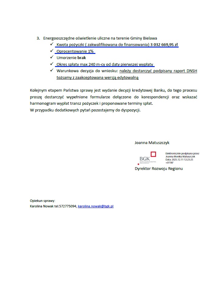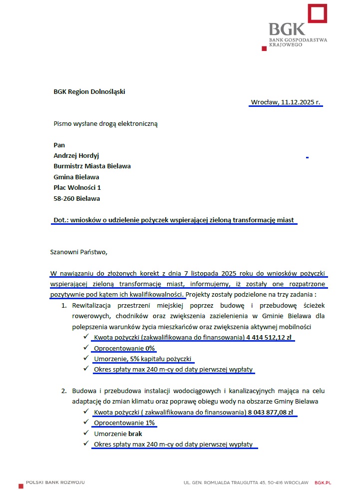 Po niemal 12 miesiącach bardzo złożonej i trudnej procedury oceny wniosku, realizowanej przez Bank Gospodarstwa Krajowego, który pełni rolę Instytucji Wdrażającej, 27.III.2026 r. podpisane zostały 3 umowy pożyczki, dzięki którym Gmina pozyskała łączną kwotę 15.491.059,15 zł.