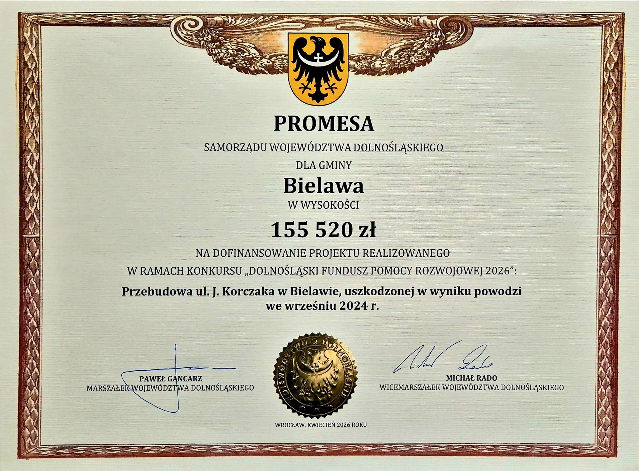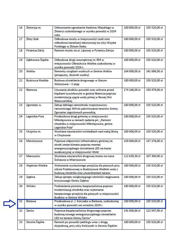 W I kwartale 2025 r. Gmina wystąpiła z wnioskiem o dofinansowanie przedmiotowego zadania z budżetu państwa. Przeszedł on pozytywnie weryfikację zarówno służb Wojewody Dolnośląskiego oraz Ministerstwa Spraw Wewnętrznych i Administracji i w efekcie 24.XI.2025 r. do Urzędu Miejskiego w Bielawie wpłynęło pismo z Ministerstwa Finansów i Gospodarki z informacją, iż bielawskiemu samorządowi przyznano wsparcie w kwocie 1.641.494 zł.