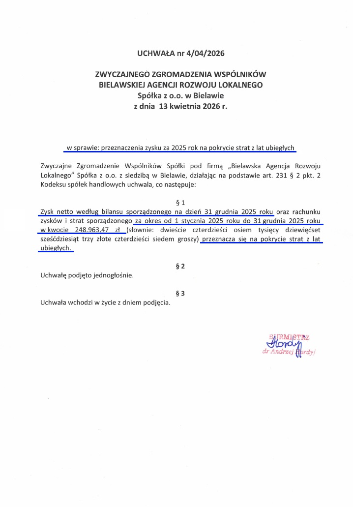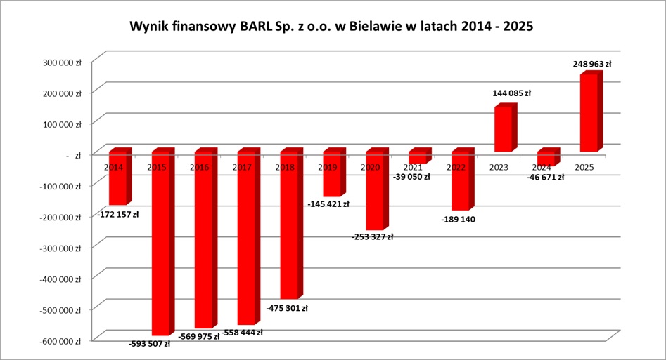 Zgodnie ze sprawozdaniem finansowym z działalności gospodarczej za 2025 r. Spółka osiągnęła rekordowy wynik finansowy. Wyniósł on 248.963 zł i w całości przeznaczony został na pokrycia strat z lat poprzednich. Osiągnięty zysk jest pozytywną konsekwencją zrealizowanego w latach 2019 - 2021 programu naprawczego.