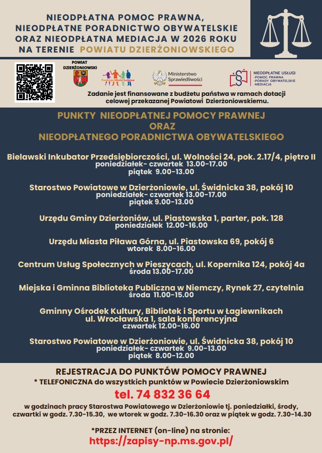 Ponadto powiat dzierżoniowski oferuje możliwość skorzystania z nieodpłatnej pomocy prawnej w wybranych punktach na terenie powiatu, aby z niej skorzystać należy wcześniej umówić się na wizytę.
