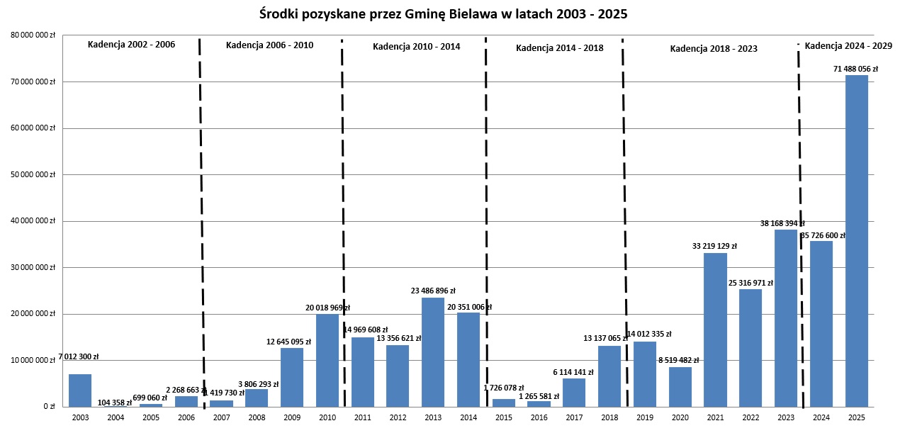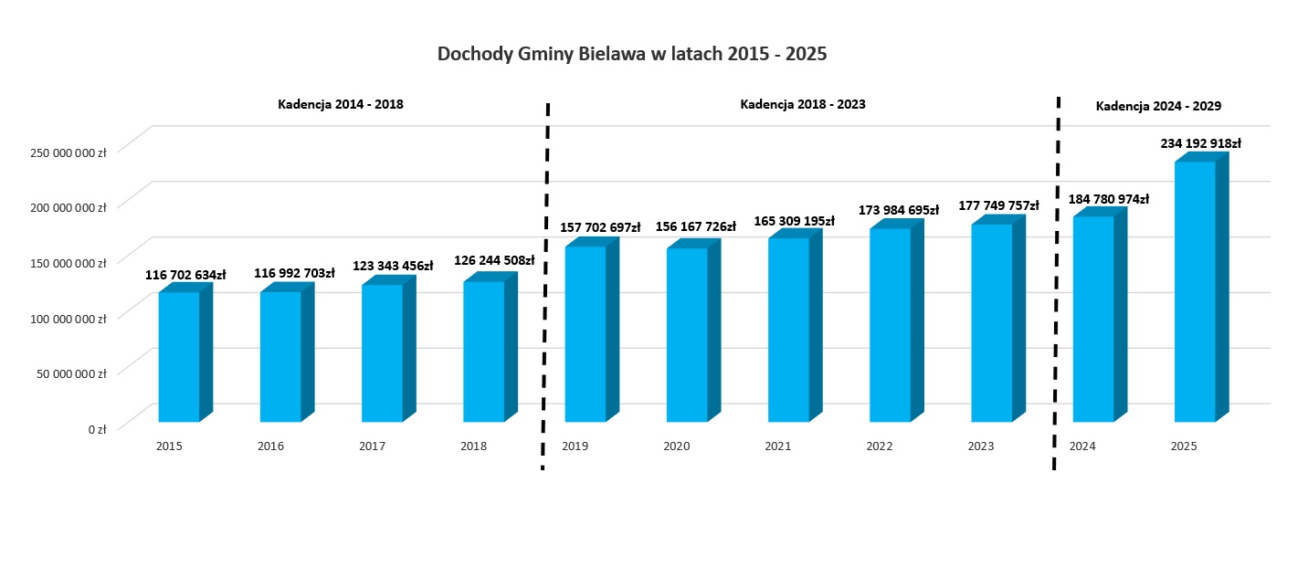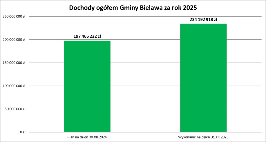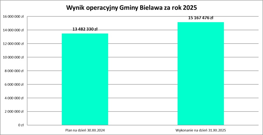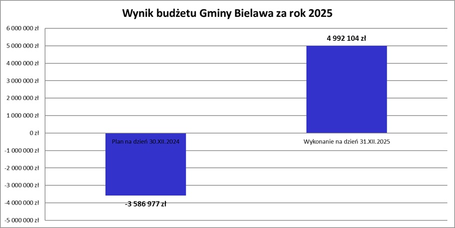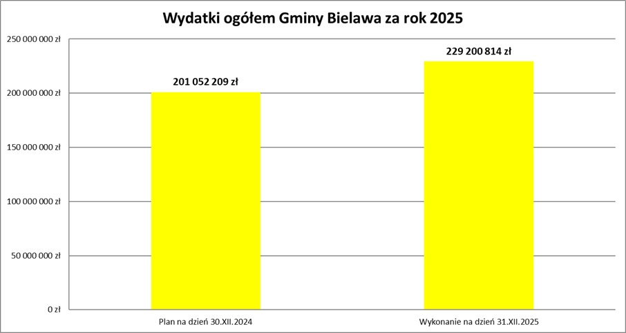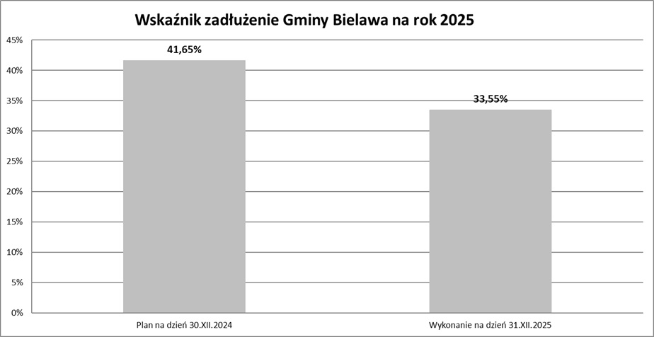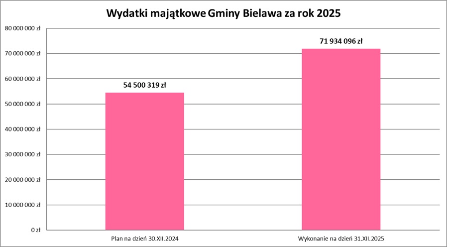 Należy również wyjaśnić, iż stosunkowo niewysoki wskaźnik realizacji wydatków majątkowych tj. na poziomie 64,3 %, ma związek z opóźnieniem we wdrażaniu programów dotyczących inwestycji drogowych. W związku z powyższym, Gmina Bielawa, realizując wielomilionowe zadania dofinansowane z budżetu państwa, zmuszona była część płatności przenieść na pierwsze półrocze 2026 r.