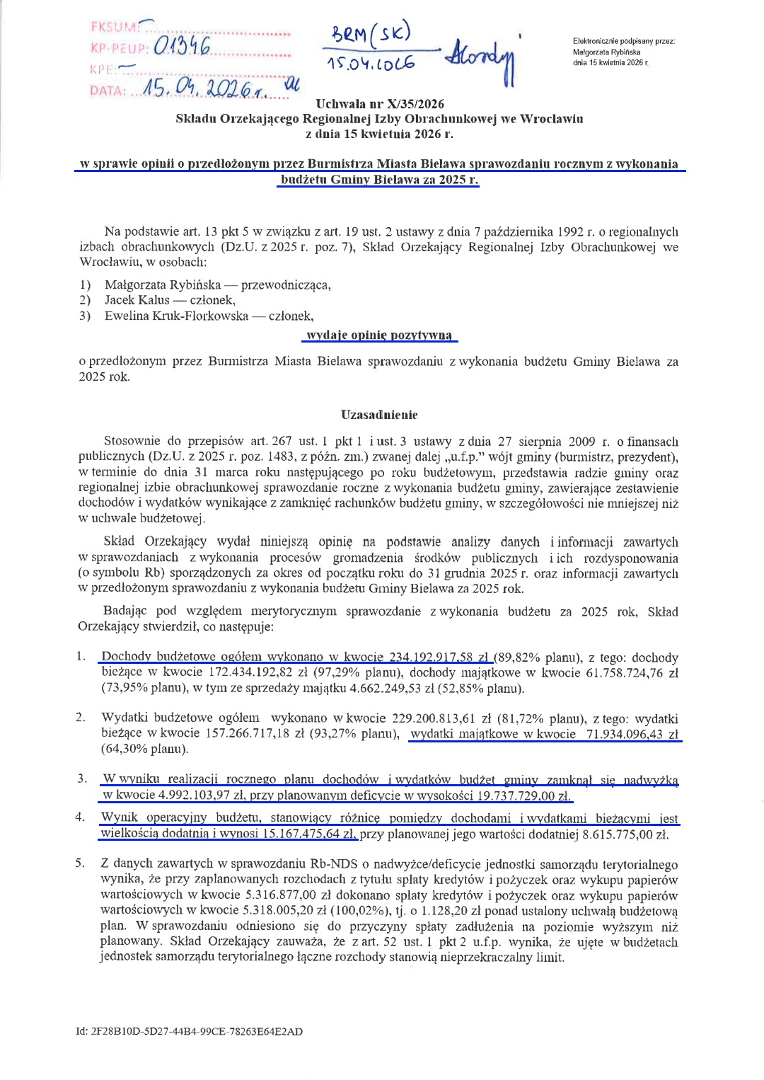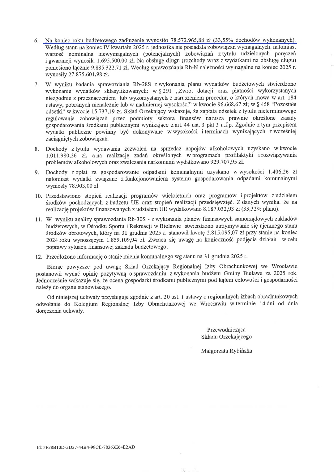 3-osobowy zespół ekspertów RIO ocenił bielawskie sprawozdanie finansowe pozytywnie, bez żadnych uwag.