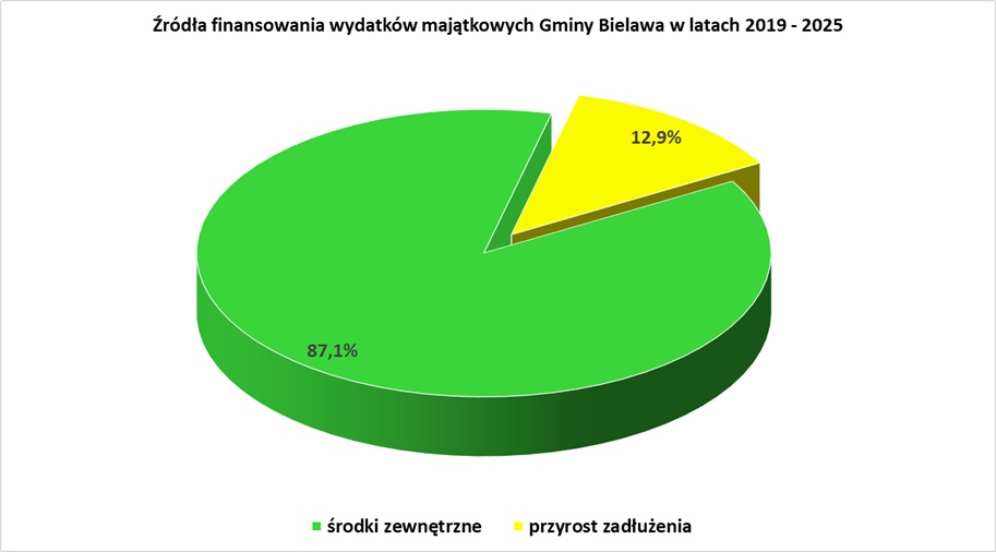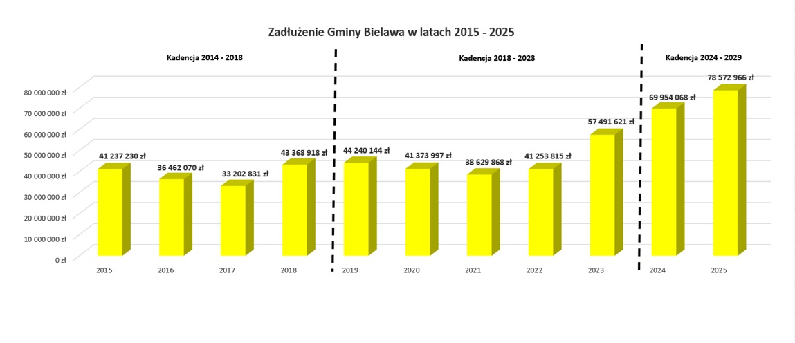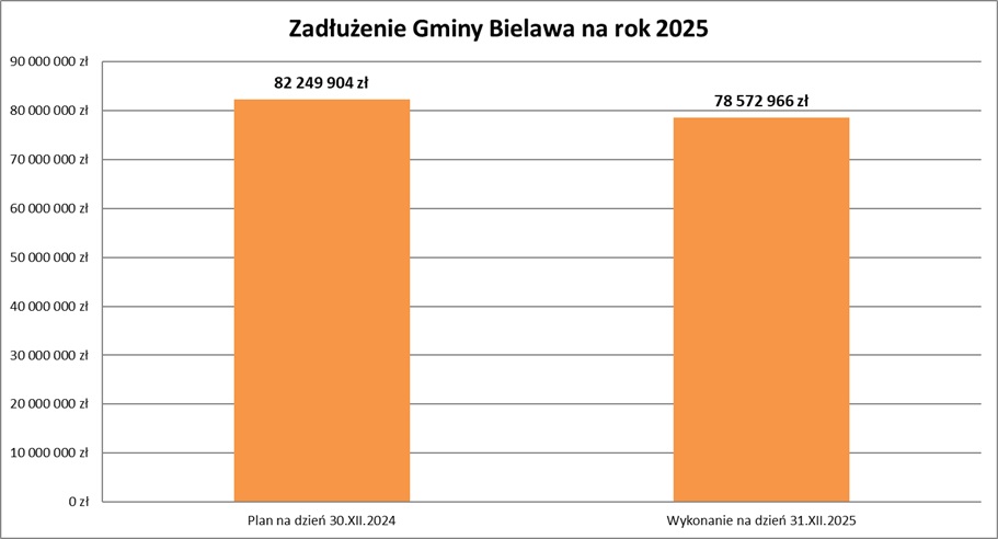 Jednym ze wskaźników, budzących najwięcej emocji wśród Bielawian, jest kwota zadłużenia. Dzięki rozsądnej realizacji planu wydatków, przy jednoczesnym bardzo skutecznym aplikowaniu o środki zewnętrzne, udało się, realizując od 2019 r. inwestycje za 273.337.577 zł, zwiększyć zadłużenie jedynie o 35.204.048 zł (tj. z poziomu 43.368.918 zł w 2018 r. do kwoty 78.572.966 zł w 2025 r.). Widać więc, że kwota wzrostu zadłużenia stanowi zaledwie 12,9 % poniesionych nakładów majątkowych, co oznacza, że były one finansowane głównie ze środków zewnętrznych.