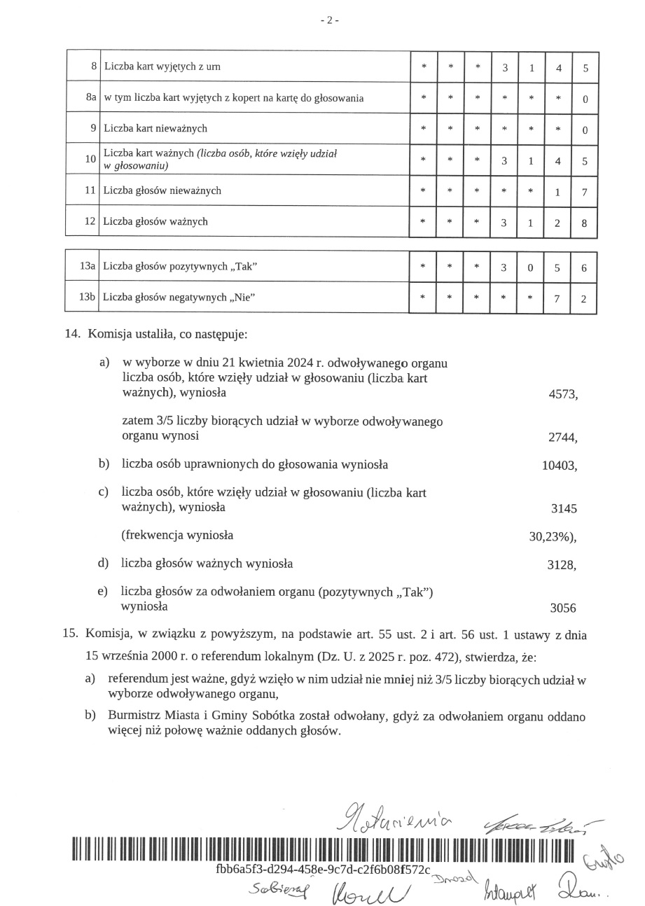 Głosowanie trwało od rana do wieczora, z frekwencją przekraczającą oczekiwania. Wynik? 3056 "tak" za odwołaniem – liczba symboliczna, jak grom z jasnego nieba. Przeciwko było mniej, a nieważne głosy nie zaważyły na wyniku. Komisja wyborcza potwierdziła ważność plebiscytu już w poniedziałek rano.