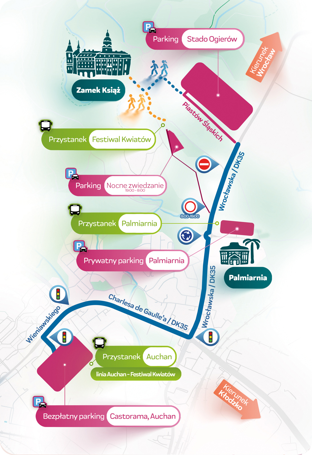 1) Bezpośrednio na przystanek festiwalowy dojeżdżają autobusy festiwalowe, które kursować będą pomiędzy Zamkiem Książ, a parkingiem marketu Auchan (ul. Wieniawskiego 19) co 20 minut, w godzinach od 09:00-19:00 w dniach festiwalu.