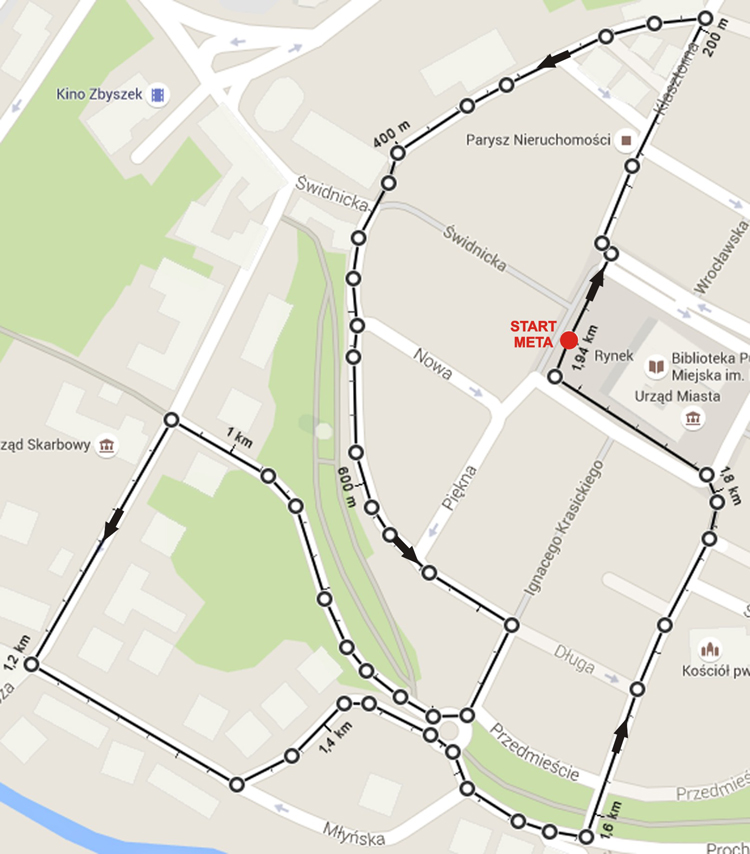Start i meta biegu, podobnie jak w roku ubiegłym, usytuowane będą w Rynku, na wprost ratusza, na wysokości ulicy Świdnickiej. Trasa wiedzie z Rynku ulicami: Klasztorną, Garncarską, Przedmieście, Krasickiego, Mierniczą, Pocztową, Krasickiego, Prochową, Kościelną z powrotem do Rynku. Długość trasy - 1963 m.