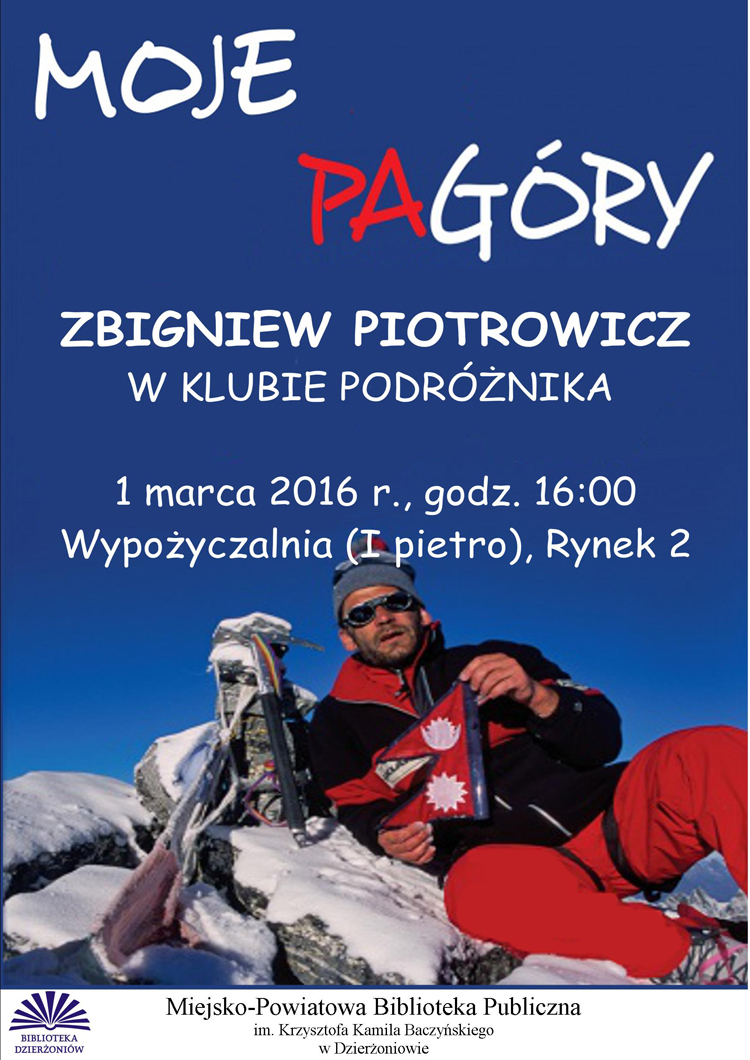 Zbigniew Piotrowicz ma na swoim koncie m.in. pierwsze wejście na Pik Edelwajs (ok. 6100 m n.p.m.) w górach Tienszan (z Andrzejem Dutkiewiczem i Zbigniewem Trzmielem) oraz wejścia na kilka innych szczytów: Pik Czetyrioch (6400 m n.p.m., samotnie) w Pamirze, Kang Yaze West (ok. 6350 m n.p.m., z Mieczysławem Krywienko) w Ladakhu i Parchamo (6273 m n.p.m., z Mieczysławem Krywienko i Januszem Mazurem) w Himalajach. O swojej książce, o której opowie na spotkaniu w Dzierżoniowie, pisze na swoim blogu tak: "Ta książka to także długi list. List, adresowany do wszystkich, którzy jeżdżą po świecie z tych samych powodów. List do przyjaciół, z którymi przeżyłem różne górskie przygody. List do moich dzieci. Chcę podzielić się z nimi tym kawałkiem świata, który odkryłem dla siebie. Aby wiedziały i zrozumiały".