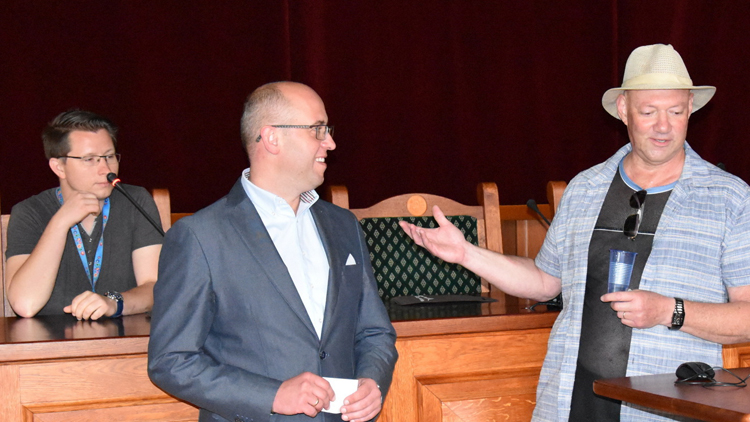 Goście spotkali się w Sali Rycerskiej z zastępcą burmistrza Dzierżoniowa Albertem Blacharzem i obejrzeli przygotowaną dla nich prezentację o mieście. Podziwiali je z wieży ratuszowej i wybili własnoręcznie monety pamiątkowe w Miejskiej Mennicy. Oprócz Dzierżoniowa, synagogi Rutika i dzierżoniowskiego cmentarza żydowskiego odwiedzą również Walim i Książ. Goście spotkali się w Sali Rycerskiej z zastępcą burmistrza Dzierżoniowa Albertem Blacharzem i obejrzeli przygotowaną dla nich prezentację o mieście. Podziwiali je z wieży ratuszowej i wybili własnoręcznie monety pamiątkowe w Miejskiej Mennicy. Oprócz Dzierżoniowa, synagogi Rutika i dzierżoniowskiego cmentarza żydowskiego odwiedzą również Walim i Książ.