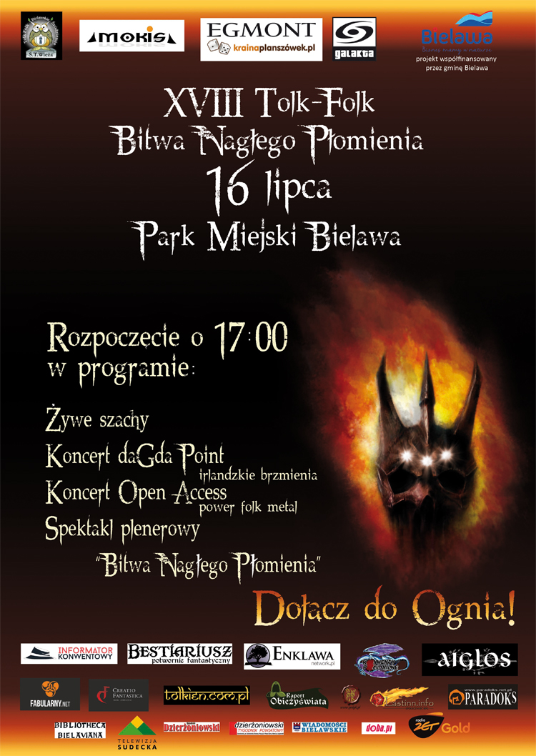 Już po raz 18 wielbiciele Tolkiena zawitają do Bielawy. Tegoroczny Tolk-Folk, organizowany przez Stowarzyszenie Tolkienowskie WIEŻA przy współpracy z Miejskim Ośrodkiem Kultury i Sztuki oraz Miastem Bielawa, jak zawsze przyciągnie wielu fanów z całego kraju. W tym roku uczestnicy przygotują dla mieszkańców Bielawy spektakl plenerowy "Bitwa Nagłego Płomienia". Oprócz tego na wszystkich gości przez cały tydzień czekają zabawy, konkursy, warsztaty i koncerty. Zwieńczenie zlotu będzie miało miejsce w sobotę w parku miejskim i rozpocznie się o godzinie 17:00. Serdecznie zapraszamy.
