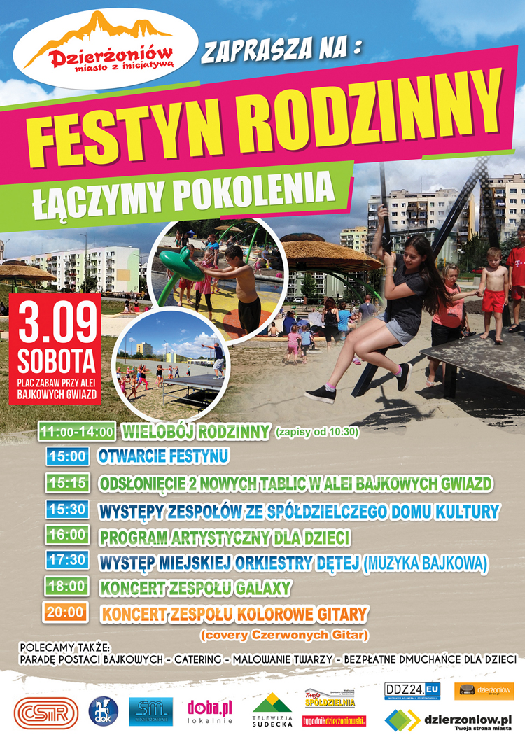 Zorganizowany w minionym roku po raz pierwszy festyn rodzinny cieszył się ogromnym zainteresowaniem. Prawdziwym hitem było pojawienie się Elzy i Misia Uszatka – pierwszych bajkowych dzierżoniowskich gwiazd. W tym roku zobaczymy znacznie ich więcej. Szczegóły na plakacie.