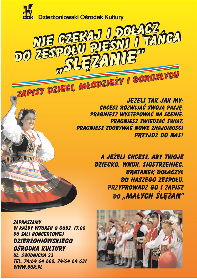 "Ślężanie" mają próby w każdy wtorek o godz. 17.00 w sali koncertowej DOK-u. Instruktorem jest Lubomir Szmidt. Istniejący od 38 lat zespół jest wizytówką Dzierżoniowa, reprezentował miasto na wielu imprezach w kraju i za granicą, m.in. na Ukrainie, w Bośni i Hercegowinie, w Czechach, Turcji czy Macedonii. W swoim programie ma folklor Dolnego i Górnego Śląska, krakowski, lubelski, rzeszowski, żywiecki oraz tańce narodowe, takie jak: polonez, mazur, krakowiak, kujawiak i oberek. W roku 1999 zespół uzyskał statut członkowski Sekcji Polskiej Rady Międzynarodowych Festiwali i Sztuki Ludowej (CIOFF).