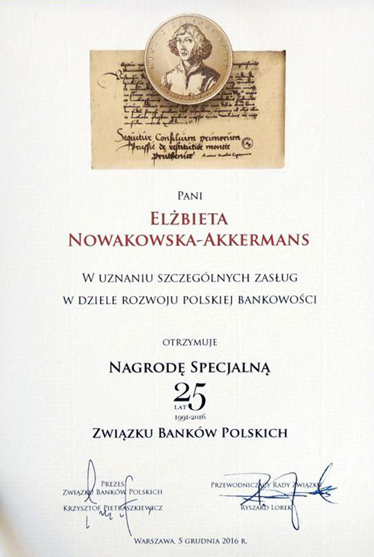 Nagrodą 25-lecia ZBP uhonorowano dwunastkę wybitnych przedstawicieli świata nauki i finansów. Wśród nich znalazła się pani Elżbieta Nowakowska-Akkermans, Prezes Banku Spółdzielczego w Dzierżoniowie. Była to forma podziękowania za wkład w budowanie stabilnych, bezpiecznych i nowoczesnych instytucji oraz usług finansowych.