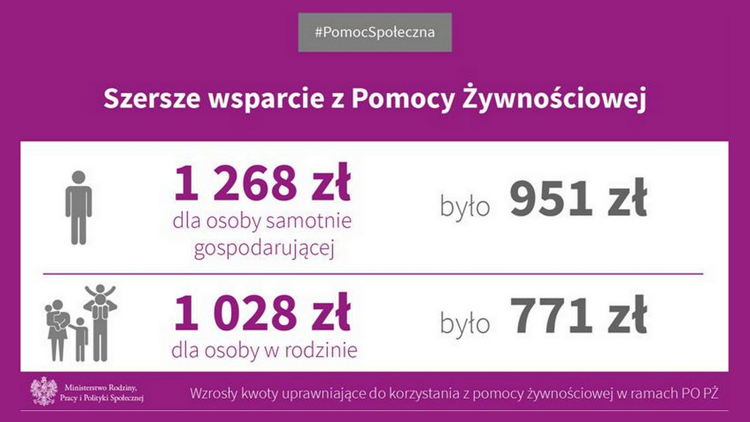 Podwyższone kwoty będą wynosić 1 268 zł dla osoby samotnie gospodarującej (dotychczas było to 951 zł) oraz 1 028 zł dla osoby w rodzinie (dotychczas 771 zł). Progi wzrosły do 200 proc. kryterium uprawniającego do korzystania z pomocy społecznej. Poprzednie kryterium w wysokości 150 proc. obowiązywało od początku realizacji PO PŻ 2014-2020, tj. od grudnia 2014 r.